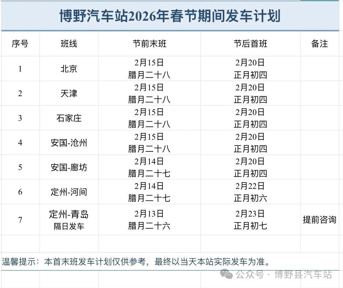 | 【2026年】博野汽车站春节期间旅客运输班次计划 |