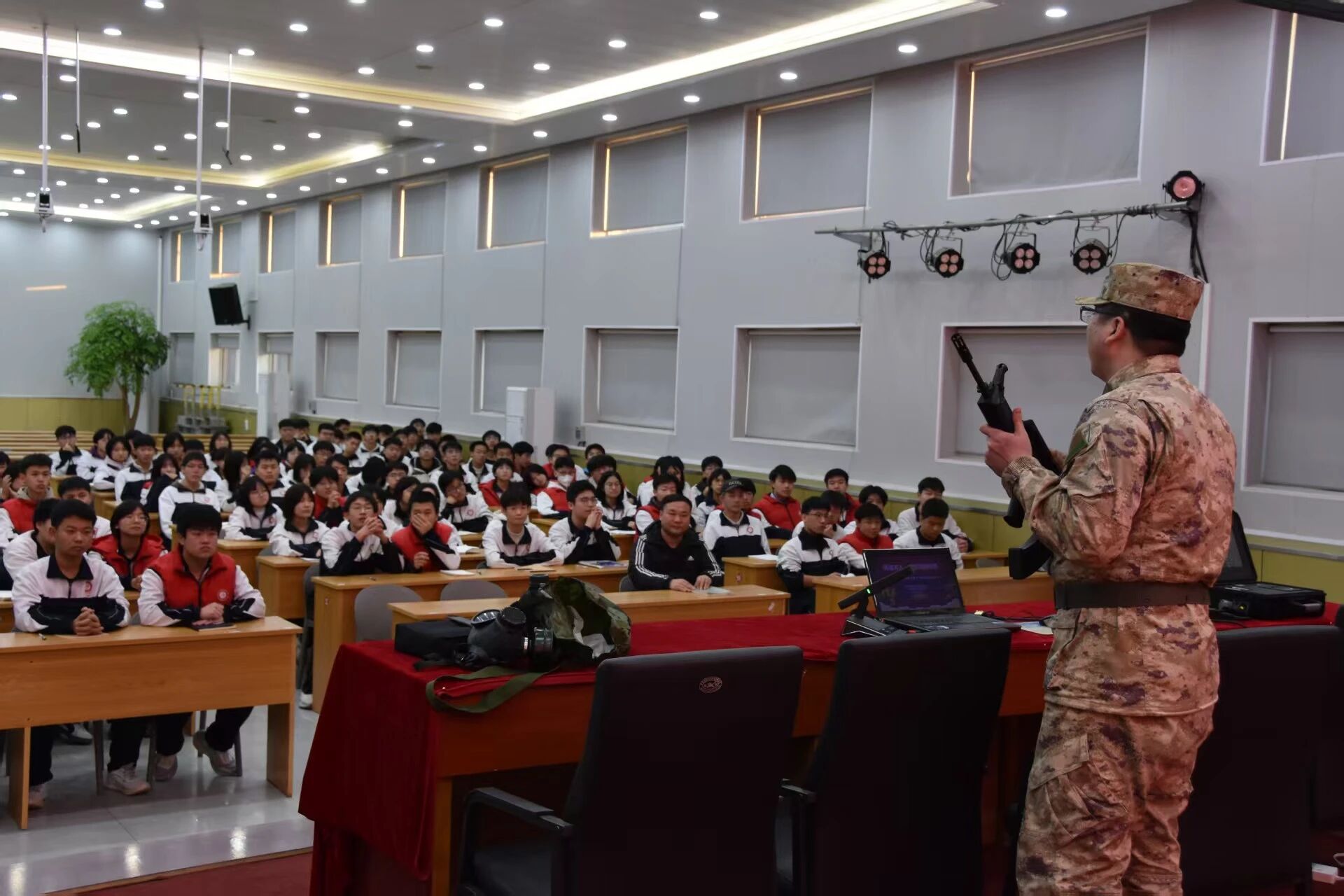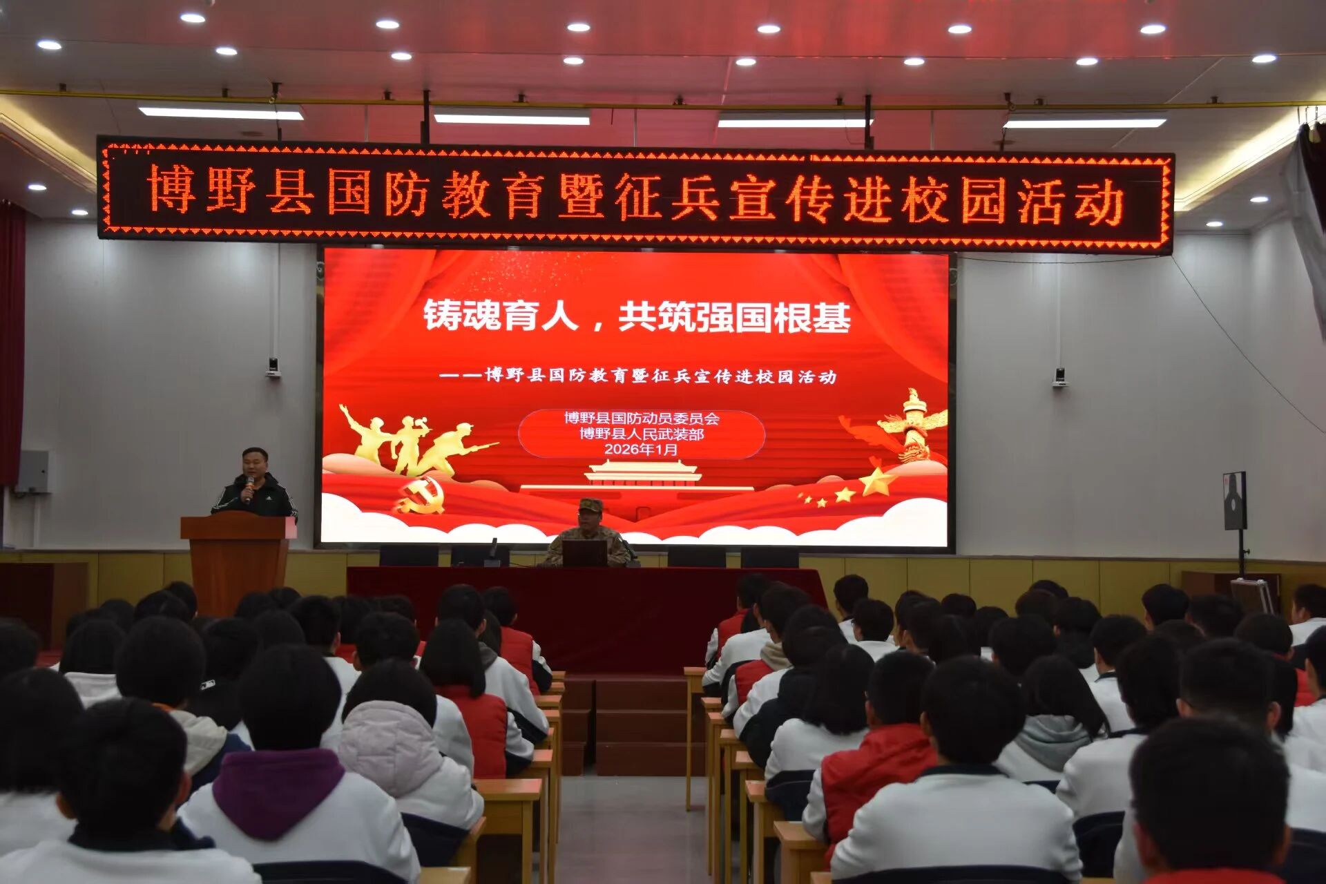 为增强青少年国防观念,激发适龄学生参军报国热情,近日,博野县征兵办联合县国动办、县教体局在博野中学开展“国防教育暨征兵宣传进校园”活动。活动以“军兵种知识宣讲+模拟射击体验”为核心展开,将军事知识科普与感受实操体验相结合,为师生们送上了一趟精彩的国防教育课。 在军兵种知识宣讲现场,县征兵办工作人员用通俗易懂的语言系统介绍了我军各军兵种的历史由来、职能使命以及对应的军事院校,让同学们深刻认识到“强国必须强军,军强才能国安”。现场互动环节,同学们围绕军校报考流程、体检政考标准以及入伍后的发展出路等热点问题进行提问,征兵工作人员耐心细致地进行解读,帮助志愿献身国防的同学们规划好未来参军之路。