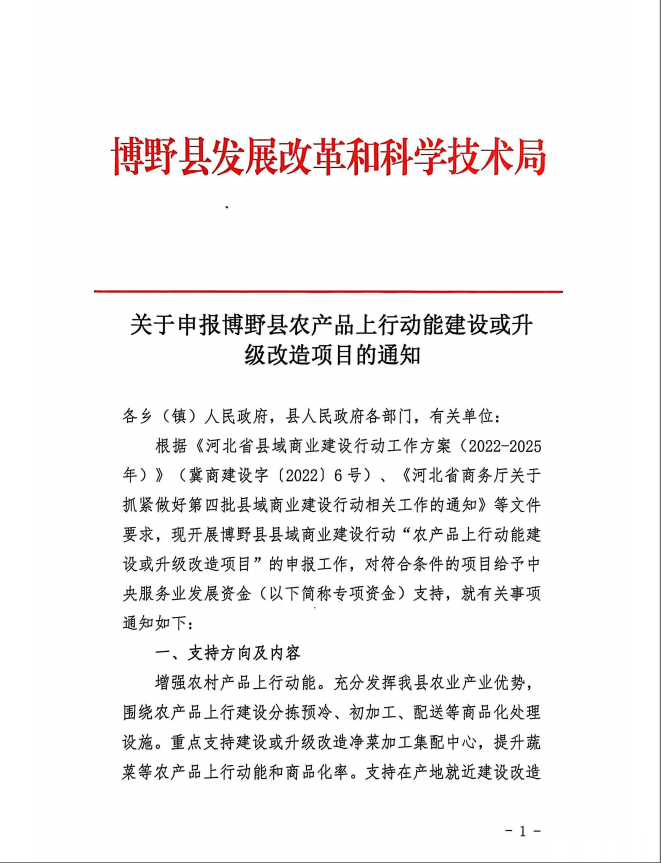 关于申报博野县农产品上行动能建设或升级改造项目的通知